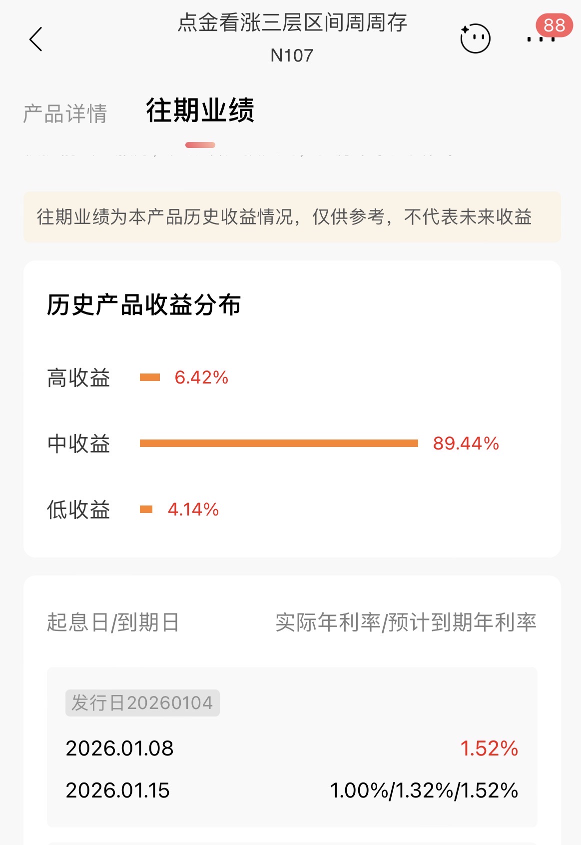 招商银行App流露,该行挂钩黄金的结构性搭理家具共15只,浩荡会展示往期功绩。以“点金看涨三层区间周周存”为例,该家具期限7天,起存金额为1万元,瞻望到期年利率为1%或1.28%或1.48%。从历史家具收益漫步来看,结束低、中、高收益的占比分别为4.14%、89.44%、6.42%。