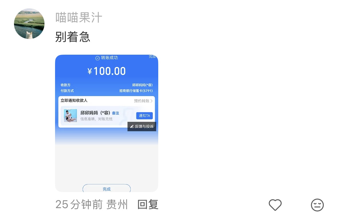就在刘女士在我方的搪塞账号上发布了乞助后,网友们也伸出了赞成。记者明慧到,在这条乞助的驳倒区里,有住在隔壁的网友斟酌刘女士今日的具体蹊径,示意会赞理寄望;有东说念主把乞助信息转发到小区业主群里;有东说念主建议联系环卫公司;还有网友晒出了转账纪录,50元、100元、200元,这些网友的ID来自北京、贵州、四川、新加坡……