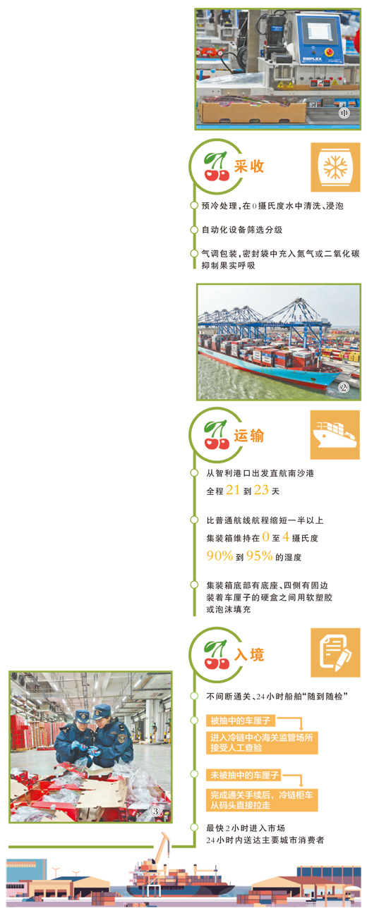 总部位于广东深圳的鑫荣懋果业科技集团股份有限公司在智利建有多个果园基地。“车厘子纯熟时,当地气温约20多摄氏度。为了提高运载中的抗毁伤能力,果农常常会在果实延伸期适量施加钙肥;采摘后,会坐窝运入隔邻的库房,进行预冷措置,根除‘田头热’。”该公司关务总监李燕先容。